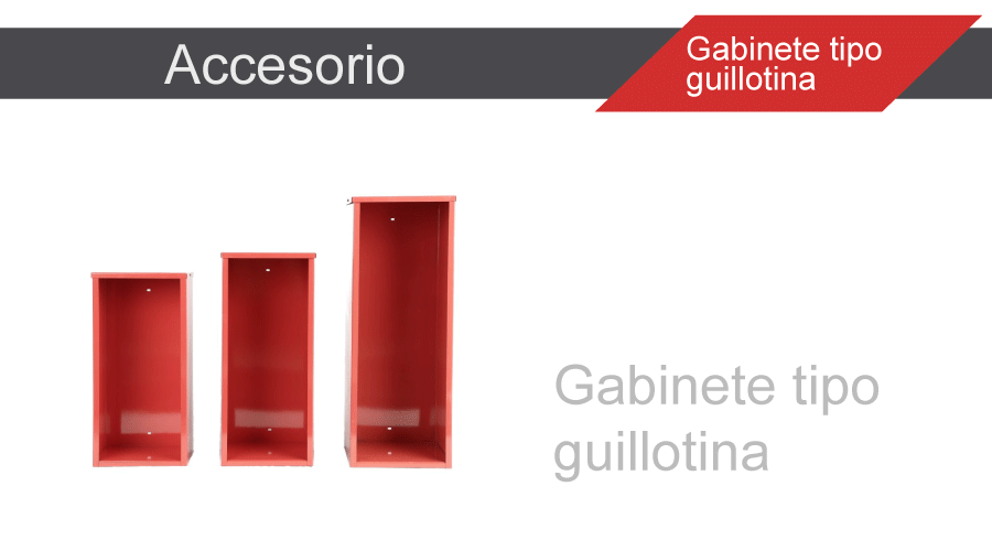 Gabinete tipo guillotina con vidrio para extintoresde distinto tipo y capacidad. Construidos bajo normasIRAM 3539, apto para utilización en colegios, hospitales,comercios, consorcios, etc. Se utilizan exclusivamenteen interiores.